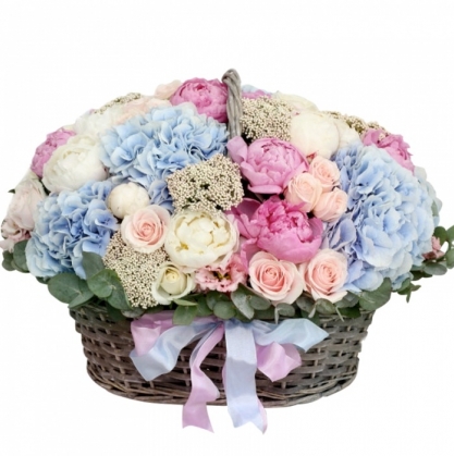 Шикарная корзинка из пионов, роз и гортензий с добавлением аллиума и эвкалипта