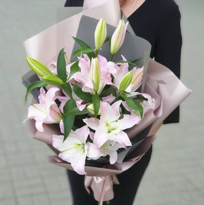 Букет из 5 розовых лилий в упаковке