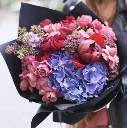Современные букет из пионов, гортензии, пионовидных роз и сирени.