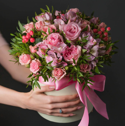 Букет в коробке из кустовых роз и альстромерии | Купить в Коломне