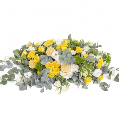 Настольная композиция из кустовых роз, хризантем и эустомы с добавлением залени, декорированная лимонами. Размеры композиции 90-100см