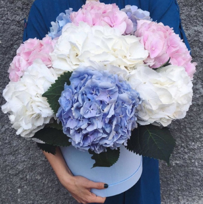 Большая коробка из разноцветных гортензий. Цветовую гамму можно изменить при согласовании с менеджером.