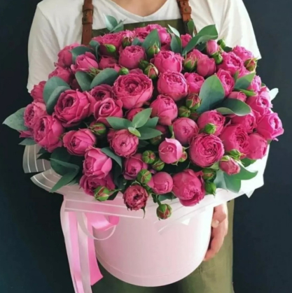 Коробка пионовидных роз с добавлением эвкалипта