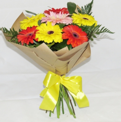 Яркий букет из гербер с добавлением рускуса и папоротника в стильной крафт упаковке.