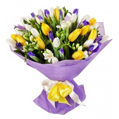 Букет "Три желания" из тюльпанов, ирисов и фрезии | Купить в Коломне